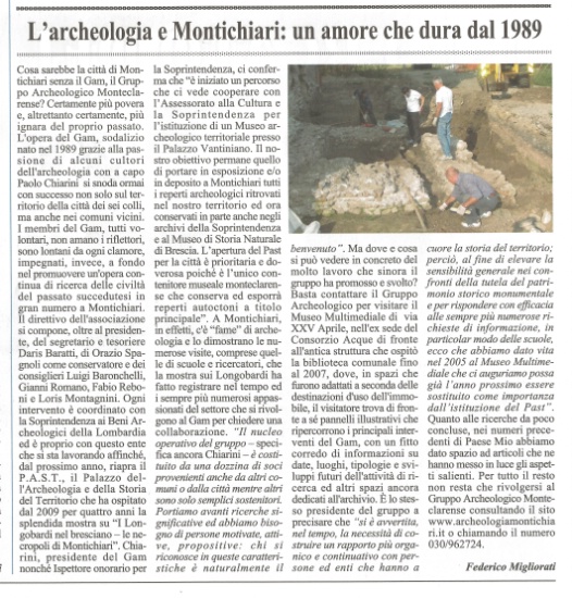 Cosa sarebbe la città di Montichiari senza il Gam, il Gruppo Archeologico Monteclarense? Certamente più povera e, altrettanto certamente, più ignara del proprio passato. L'opera del Gam, sodalizio nato nel 1989 grazie alla passione di alcuni cultori dell'archeologia con a capo Paolo Chiarini si snoda ormai con successo non solo sul territorio della città dei sei colli, ma anche