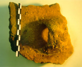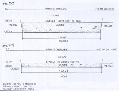 In cima a M. Rotondo emergono le evidenze archeologiche del bronzo più corpose, per quanto conosciamo attualmente; questo colle ha una conformazione più allargata rispetto agli altri e presenta un pianoro esteso circa 40.000 mq sul lato nord. Qui si sono trovati i primi frammenti appartenenti a contenitori in ceramica grezza e limitati sondaggi in profondità hanno confermato l’esistenza sotto il coltivo di un deposito antropico spesso 60 centimetri; curiosamente, però, i reperti erano situati tutti in una striscia larga da 2 a 3 metri, cromaticamente più scura rispetto al colore giallognolo del morenico fresco. Grazie alla collaborazione di Basilio Rodella, specialista in foto aree, sia al naturale che all’infrarosso, siamo stati in grado di vedere nella sua totalità ciò che si era notato in superficie. La striscia sopra menzionata circonda per tre lati un’area di 250x150 metri e sarà obiettivo delle prossime ricerche individuare l’esatta posizione del quarto lato, sul versante nord. L’ipotesi più accreditata dagli archeologi è che si tratti di un vallo difensivo costruito tutt’attorno ad un villaggio che occupava un’area di circa 3 ha; la colorazione chiara del morenico fresco ai lati di questo serpentone è da riferire probabilmente al terrapieno messo in opera col terreno derivato dallo scavo del vallo, ipotesi che sarà possibile accertare con uno scavo mirato. Durante il bronzo medio si sviluppa in Emilia, ad occidente del Panaro, una particolare cultura denominata terramaricola; una caratteristica costante dei villaggi terramaricoli, attestata già da scavi eseguiti alla fine del secolo scorso, era quella di essere circondati da imponenti palificate ed altrettanto massicci terrapieni, eretti a scopo difensivo. Nel medesimo periodo la cultura palifitticola della Polada, caratterizzata da capanne lignee costruite sul limitare dell’acqua, si sviluppa sul Garda, sui laghetti inframorenici della prima e della seconda cerchia ed attorno ai laghi montani. Sarà interessante, nell’approfondire l’indagine archeologica su Monte Rotondo, riuscire a stabilire la sequenza cronologico-insediativa, i dati significativi dell’insediamento in base alle strutture che si sono conservate ed ai reperti recuperati; sarà così possibile comprendere a quali delle due culture sopracitate, durante il bronzo medio, le comunità del nostro territorio erano culturalmente e socialmente più affini. (P.C.)
